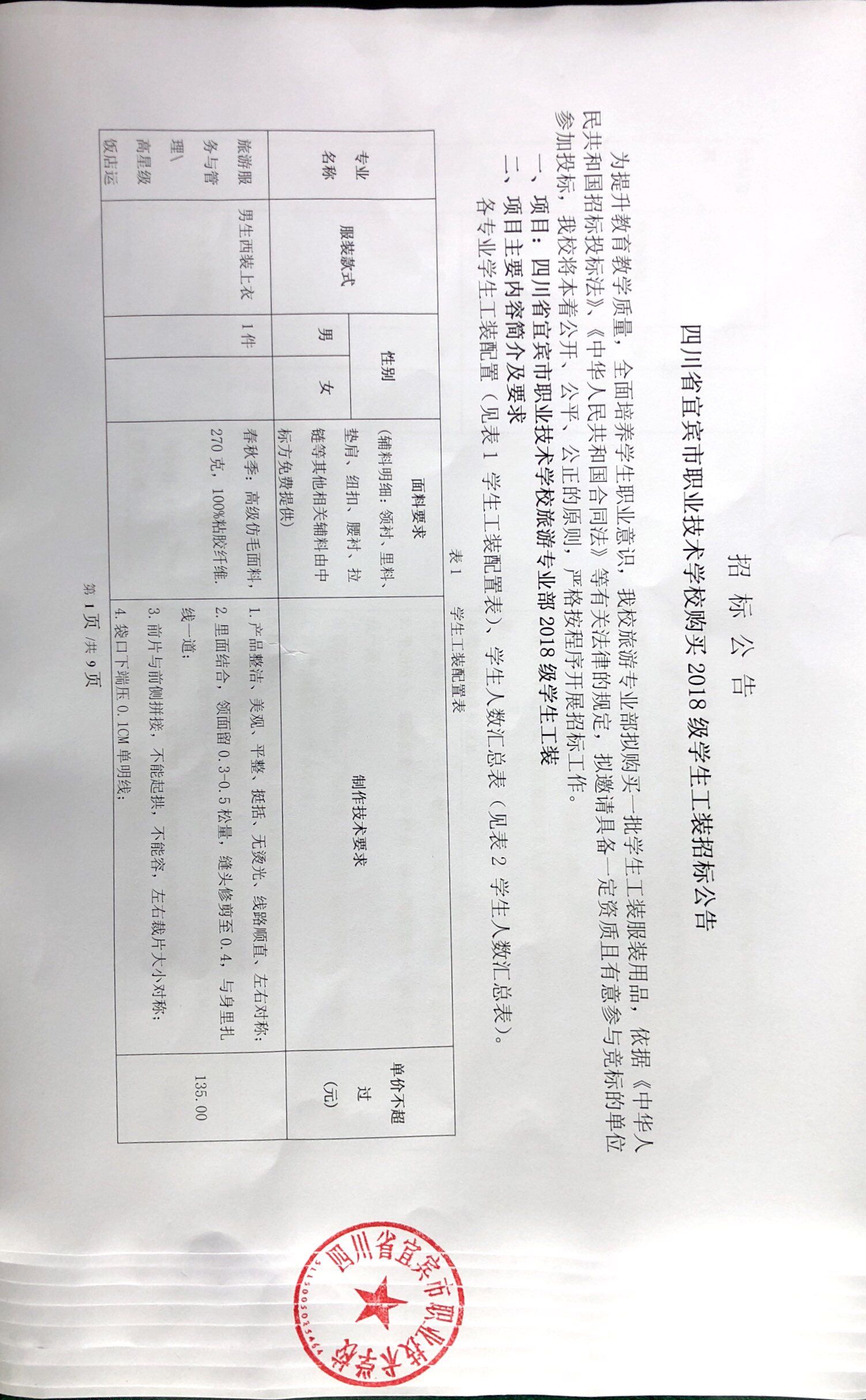 机电专业部2018级学生工装招标公告