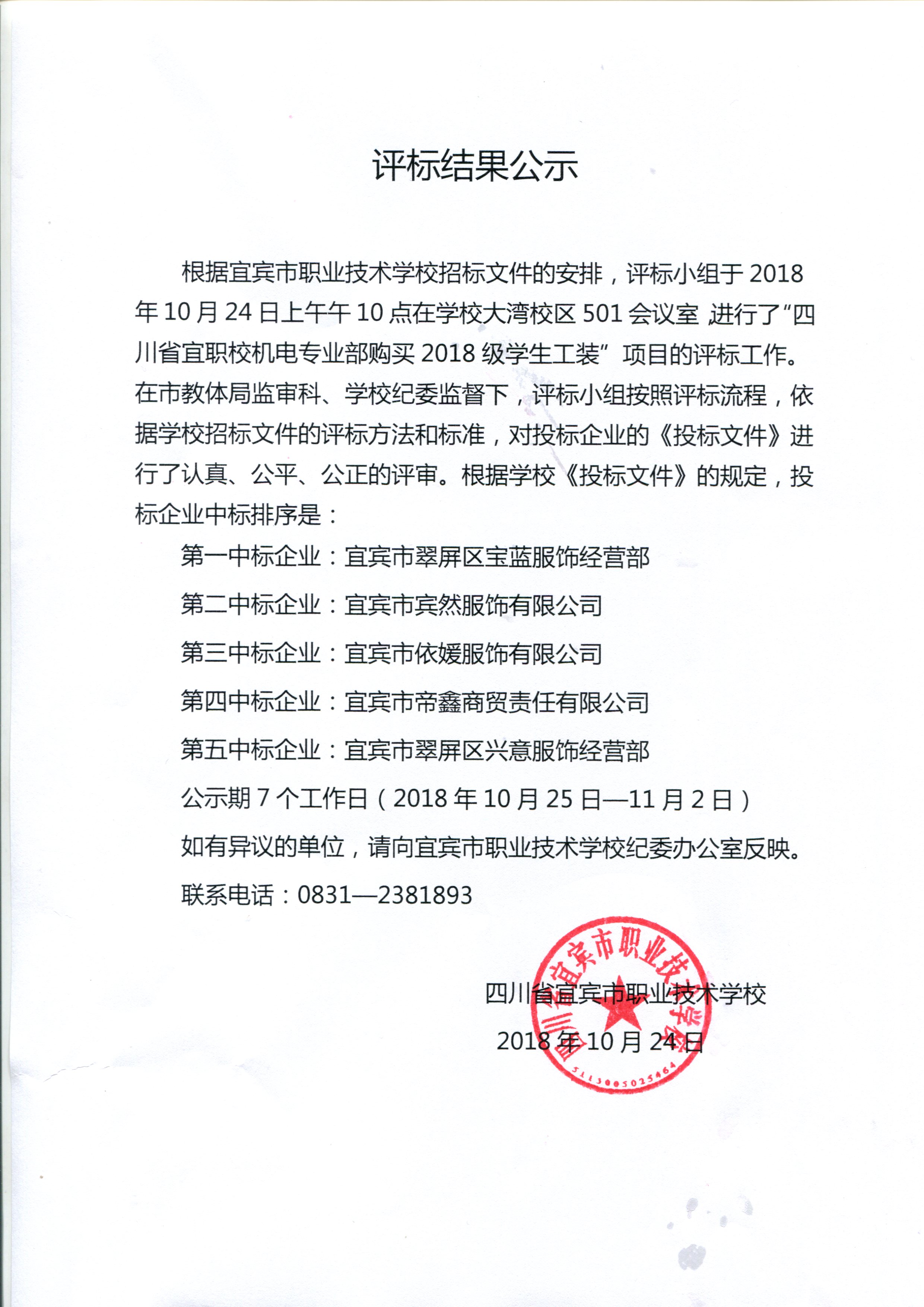 计应工装评标结果公示