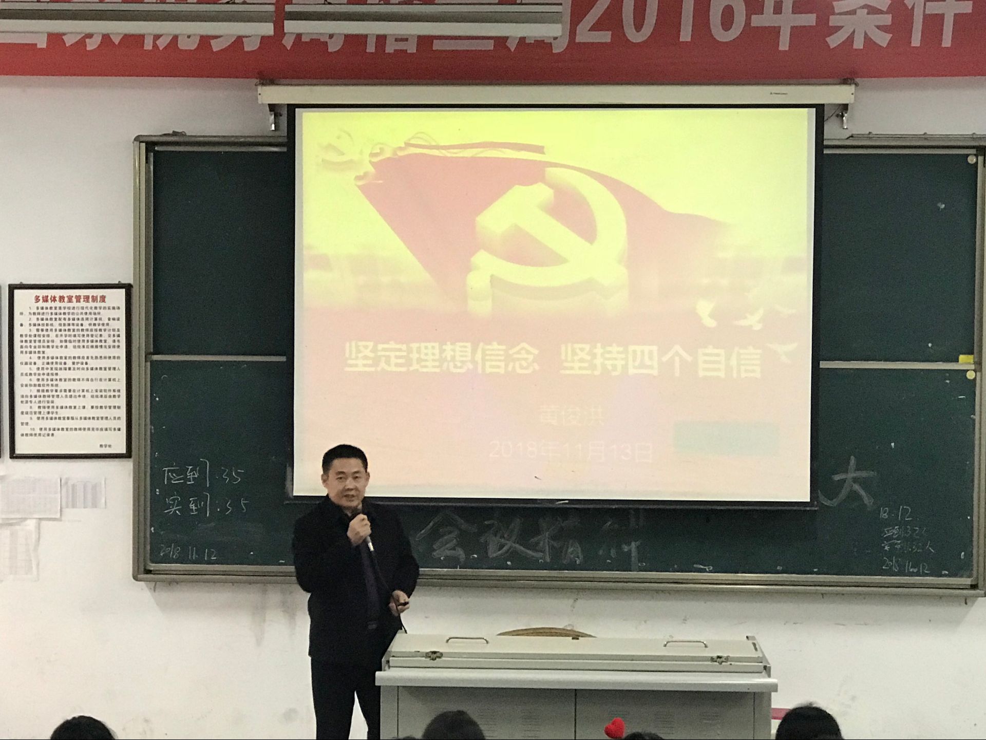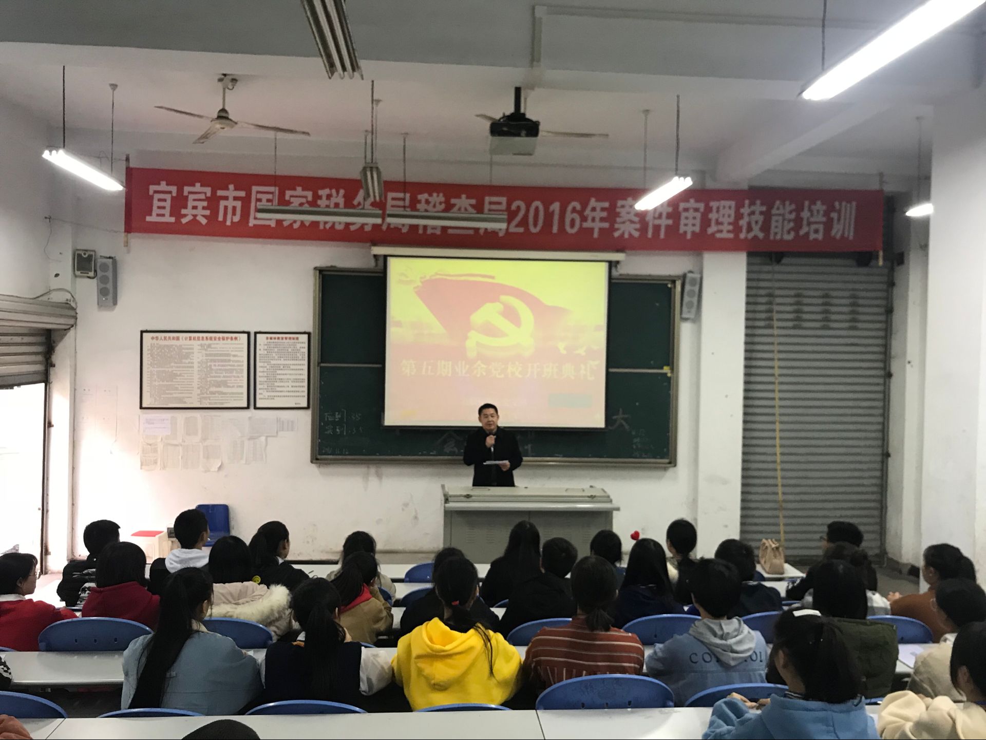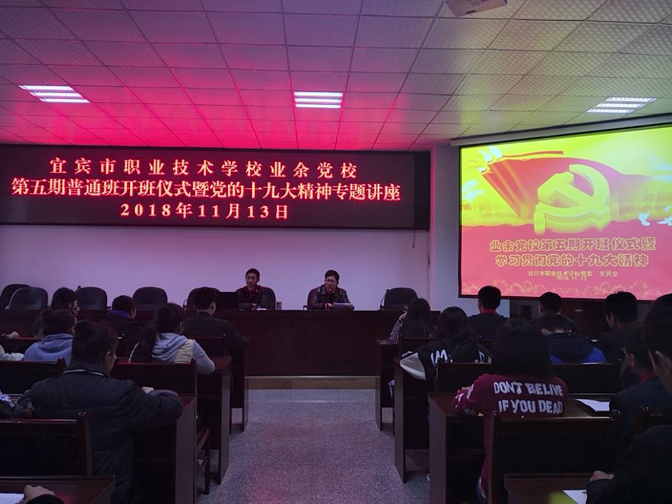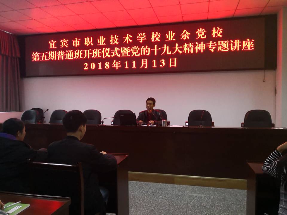 11月13日下午,宜宾市职业技术学校业余党校第五期普通班开班仪式暨十九大精神专题讲座分别在大湾校区和龙湾校区同时举行。党委委员、纪委书记吴开泉同志参加了大湾校区的开班仪式并主讲第一专题学习贯彻十九大精神,党委委员、副校长黄俊洪同志参加了龙湾校区的开班仪式并围绕“坚定理想信念,坚持四个自信”主题开展了专题讲座。我校5名优秀青年教师和147名追求进步的学生分校区参加了开班典礼。