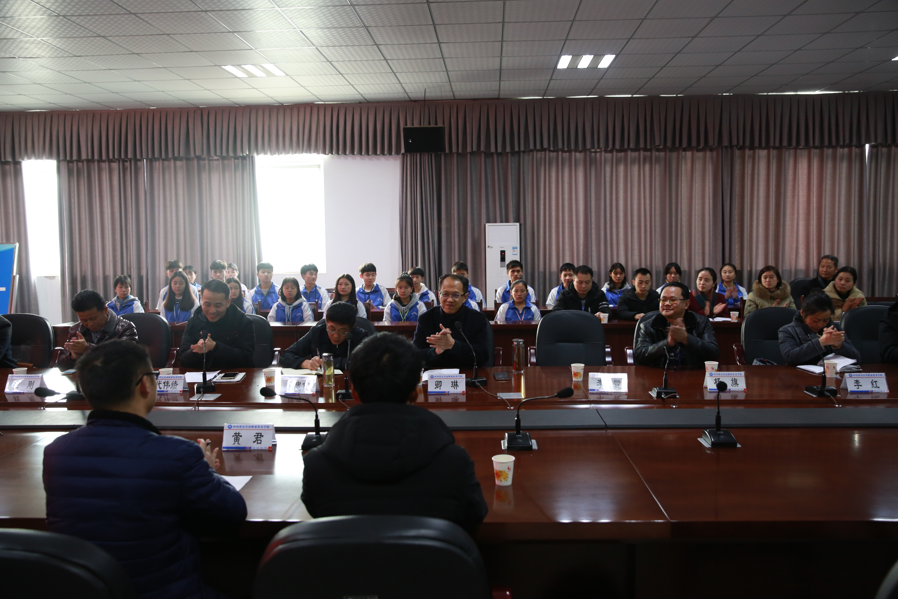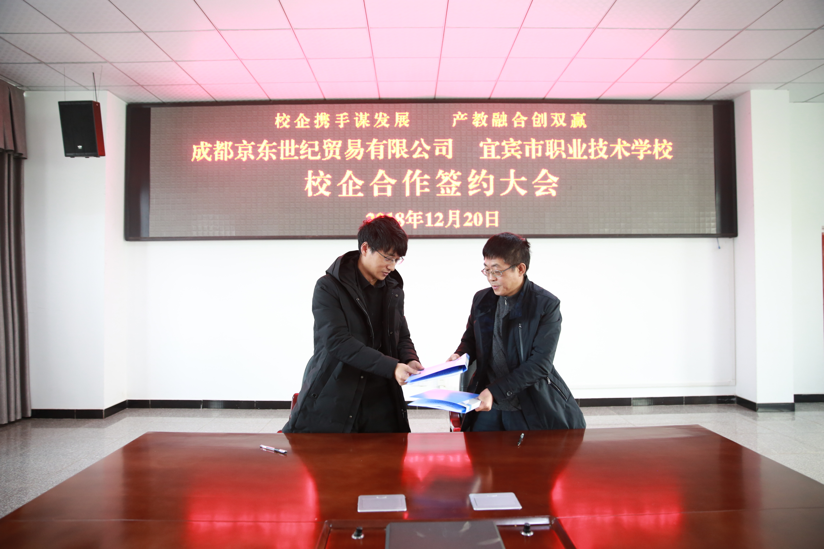 2018年12月20日下午,我校与成都京东世纪贸易有限公司校企战略合作签约大会在学校大湾校区乐业楼501会议室隆重举行。京东西南区校企合作高级经理王飞,京东物流西南区人力资源经理黄君,宜宾职业技术学校校长卿琳,副校长何忠前,行政办公室主任杜刚,教学处主任李霆,招就处主任代伟绩、副主任黄兵,经贸部主任杨旗,副主任李红、李天平及经贸部师生代表30余人共同出席了本次签约仪式。
