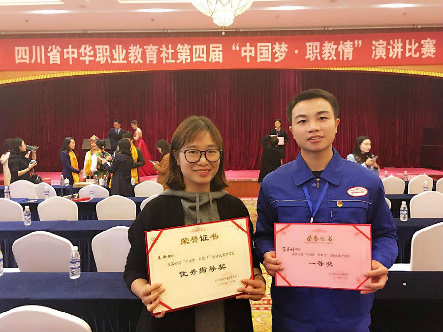 2017年11月17日,由四川省中华职业教育社主办的第四届“中国梦•职教情”演讲比赛在德阳举行。来自全省的15所高职院校、16所中职院校参加了比赛。经过激烈角逐,我校汽修专业部2015级单招班的范灵利在王玲老师的指导下以出色的表现夺得中职组一等奖。