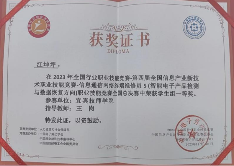 近日,由中国电子劳动学会、中国就业培训技术指导中心、中国国防邮电工会全国委员会共同主办的2023年全国行业职业技能竞赛 - 第四届全国信息产业新技术职业技能竞赛-信息通信网络终端维修员S (智能电子产品检测与数据恢复方向)职业技能竞赛在广西工商技师学院报告厅圆满落幕。