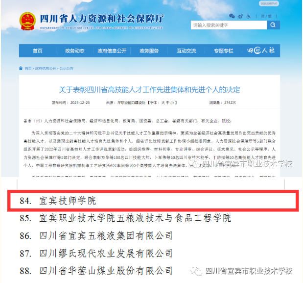 12月26日,四川省人力资源和社会保障厅公布《关于表彰四川省高技能人才工作先进集体和先进个人的决定》,宜宾技师学院获得四川省高技能人才工作先进集体。