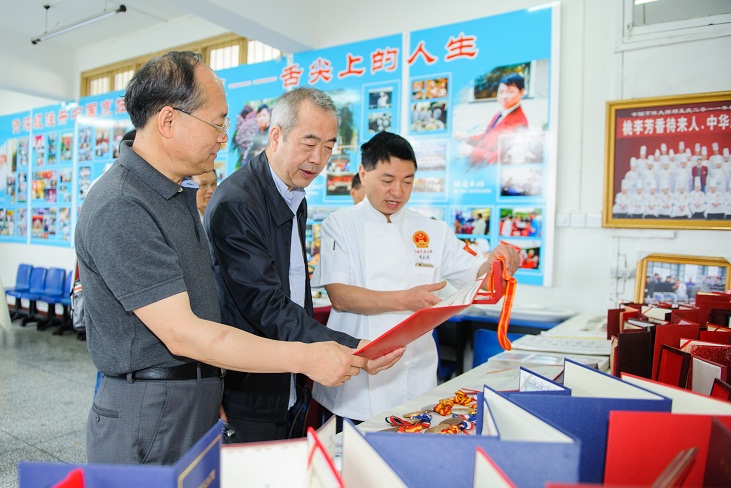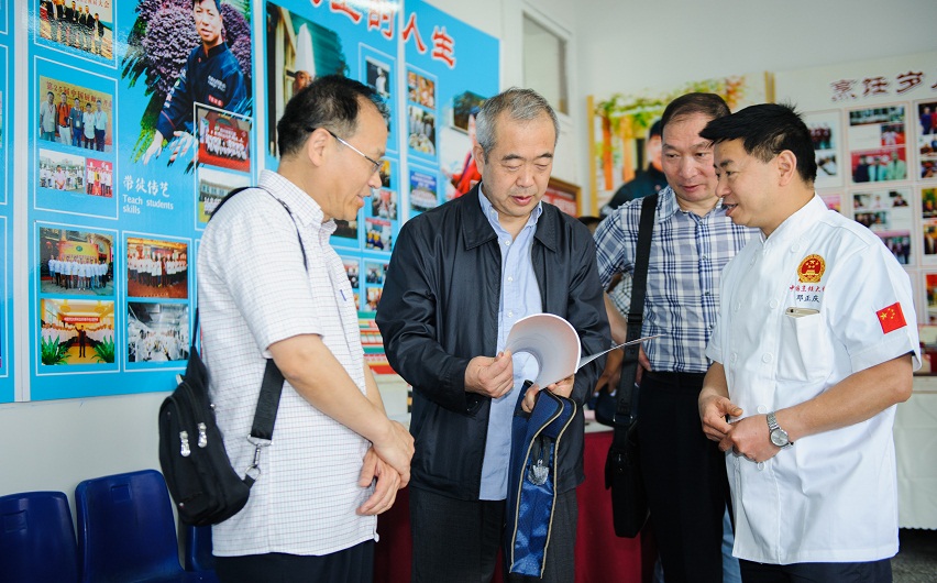 考察组参观了设在我校龙湾校区内的宜宾市邓正庆烹饪技能大师工作室,随后在大湾校区现场观摩了我校的学生技能培训基地、宜宾市机械加工专业技能大师工作室和市劳模(高技能人才)创新工作室,以及正在举行的第六届“宝和杯”中职学生技能大赛暨职业教育宣传周活动,并召开了职业能力建设座谈会。