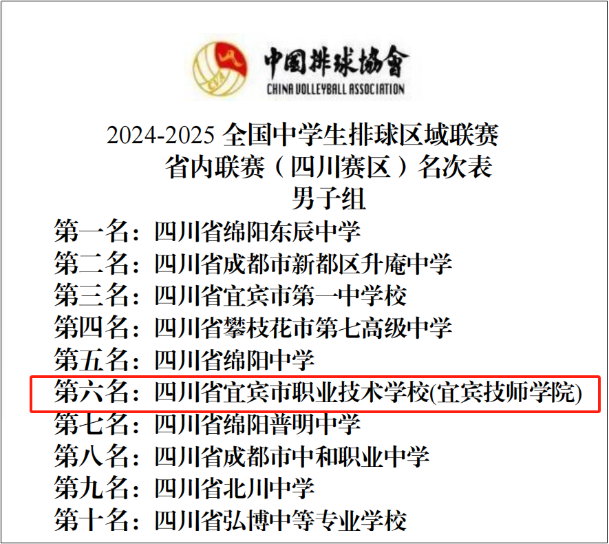 为推广普及排球运动,夯实排球后备基础,加快推动“体教融合”向深度开展,2024年5月29日-6月2日,在四川省绵阳市涪城区举办由国家体育总局、中国排球协会主办的2024-2025全国中学生排球区域联赛省内联赛(四川赛区)。我校斩获高中男子组第六名(中职学校第一名)的佳绩,学生罗犀荣获体育道德风尚运动员奖。