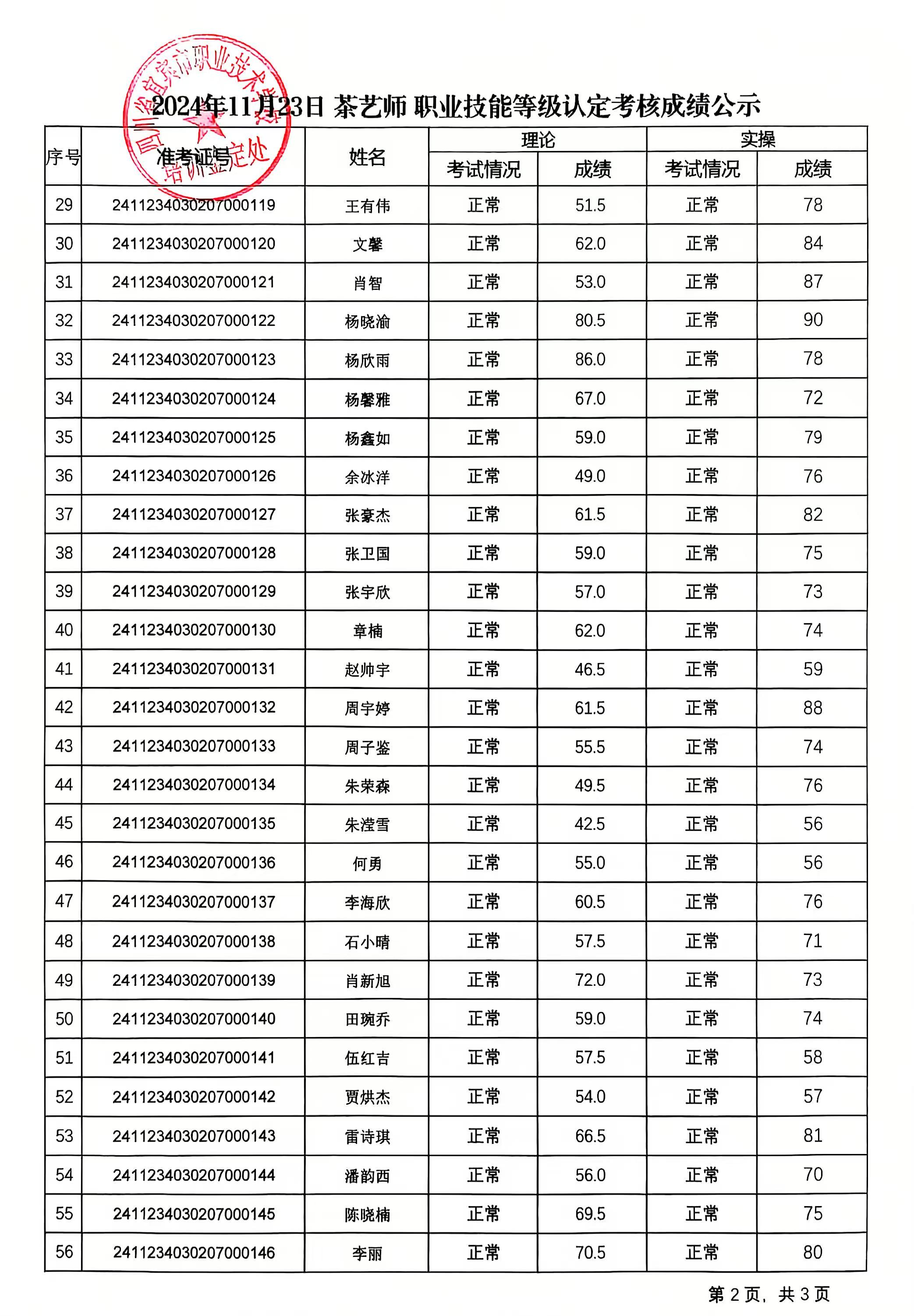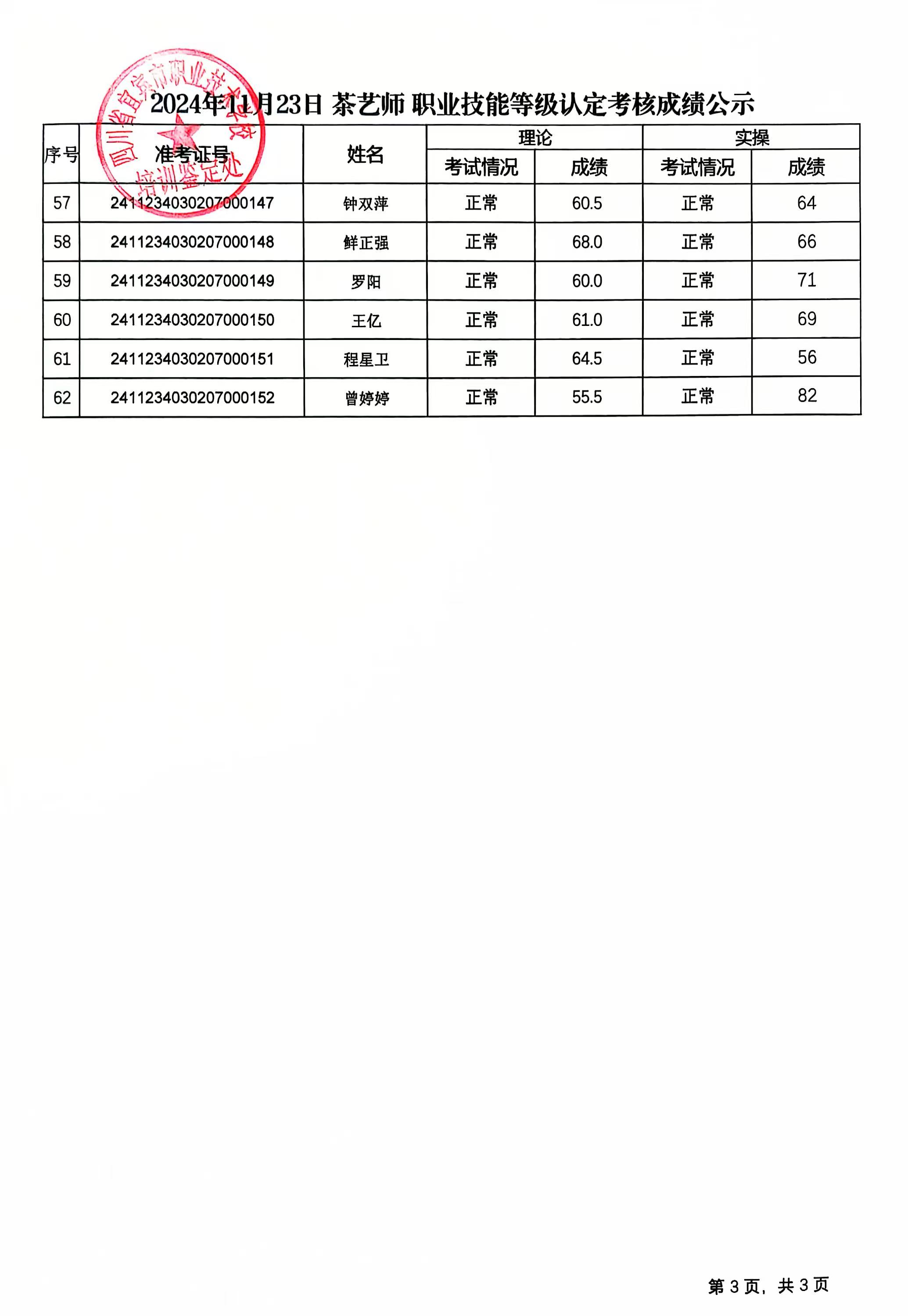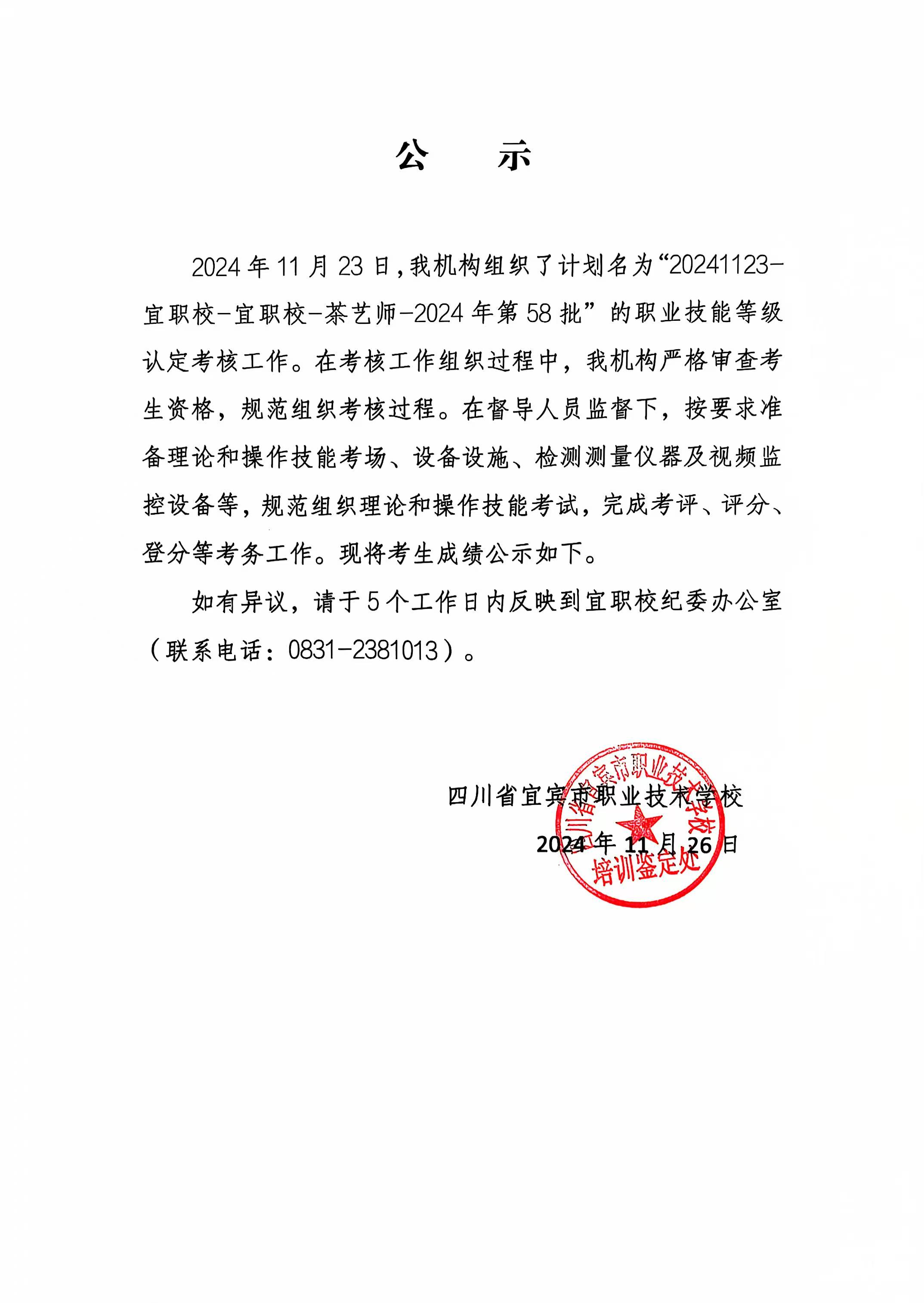 20241123宜职校茶艺师三级五级职业技能等级认定成绩公示(第58批)