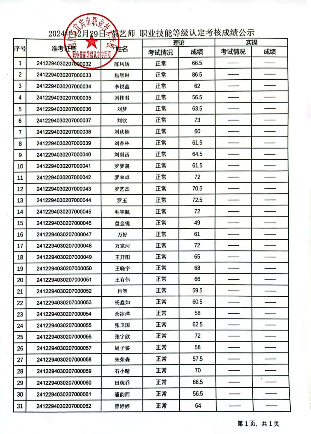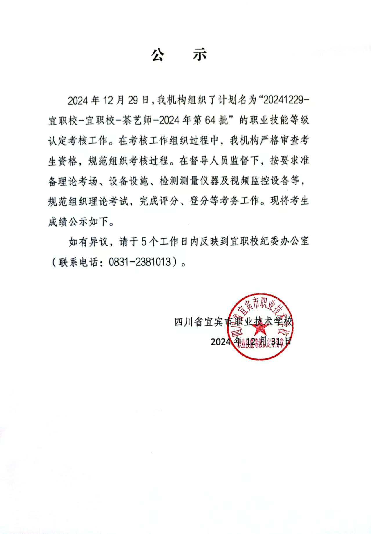 20241229宜职校茶艺师五级职业技能等级认定成绩公示(第64批)