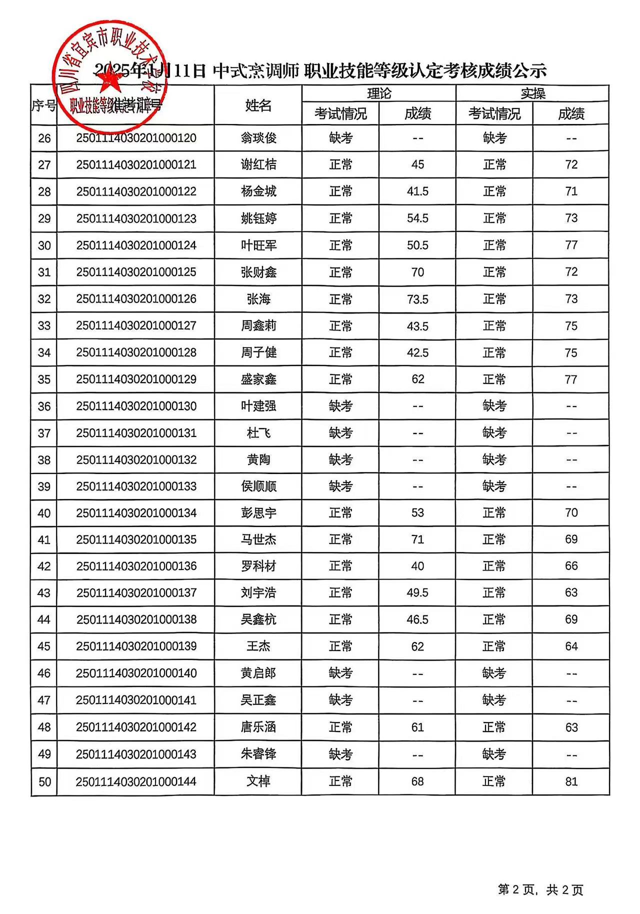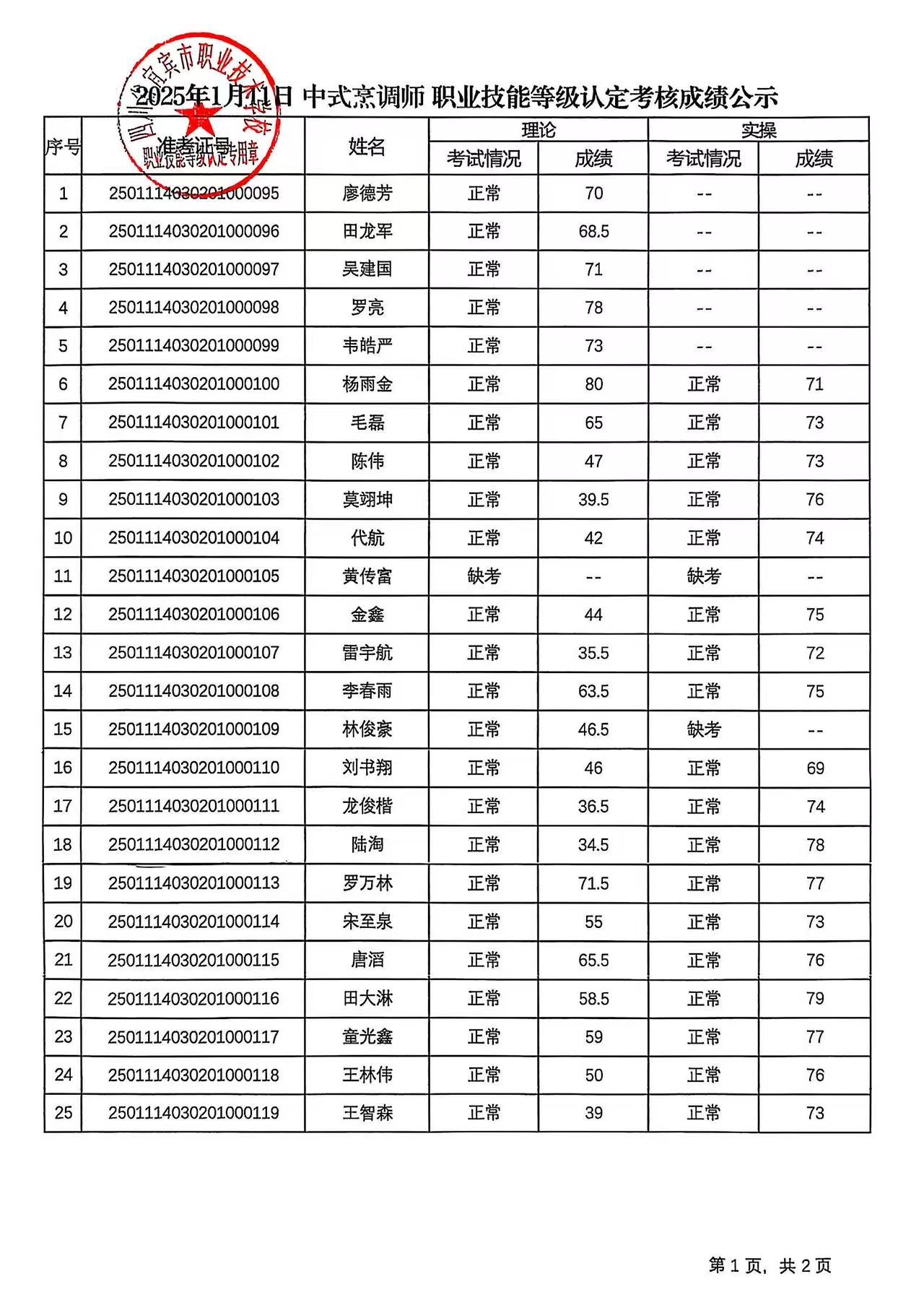 20250111宜职校中式烹调师三四级职业技能等级认定成绩公示(第1批)