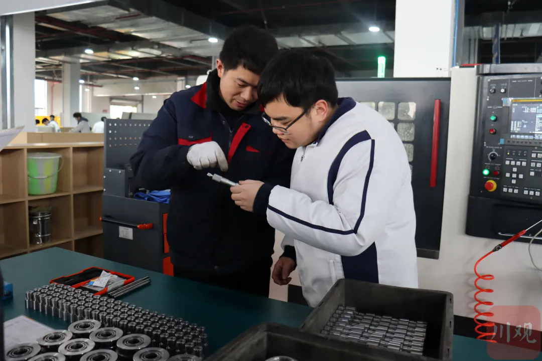 基地内划分出智能网联汽车应用技术实训区、焊接实训区、数控加工中心实训区等多个区域。在师带徒生产实训区,学生身着工装,与来自宜宾各机械厂的技术导师并肩操作设备。学生上手加工实践的并非教学材料,而是一线工厂所加工的同款零件。企业导师不仅传授技能,还将生产一线的常见问题融入教学,让学生提前了解行业所需,适应岗位需求。