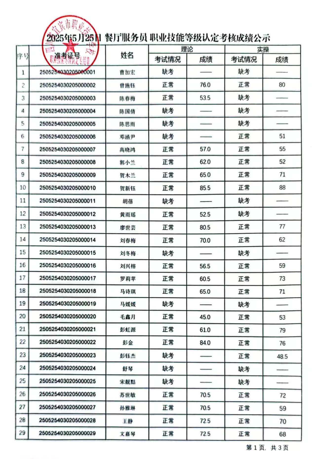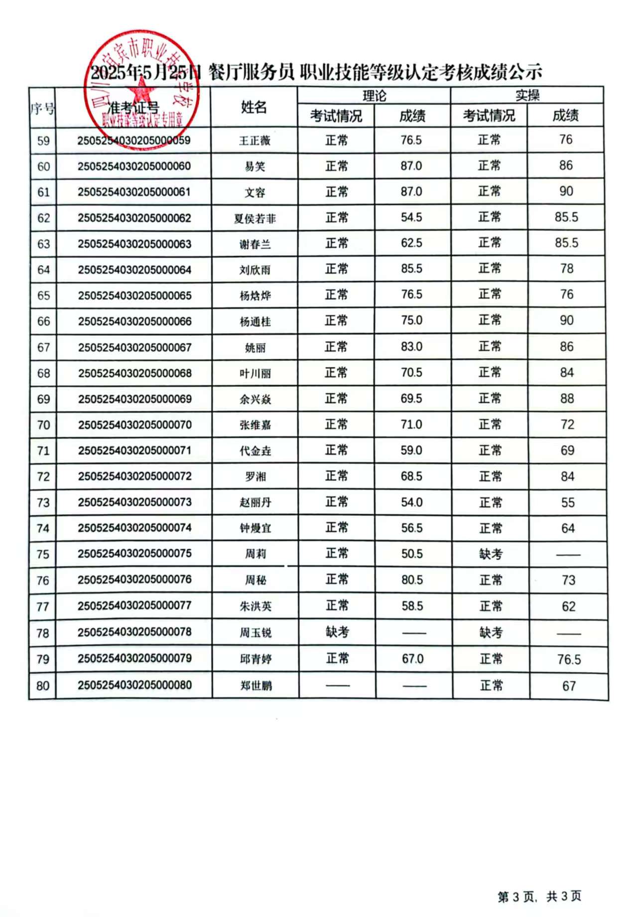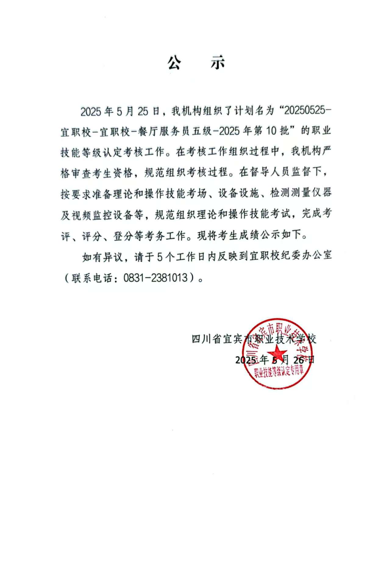 20250525宜职校餐厅服务员五级职业技能等级认定成绩公示(第10批)
