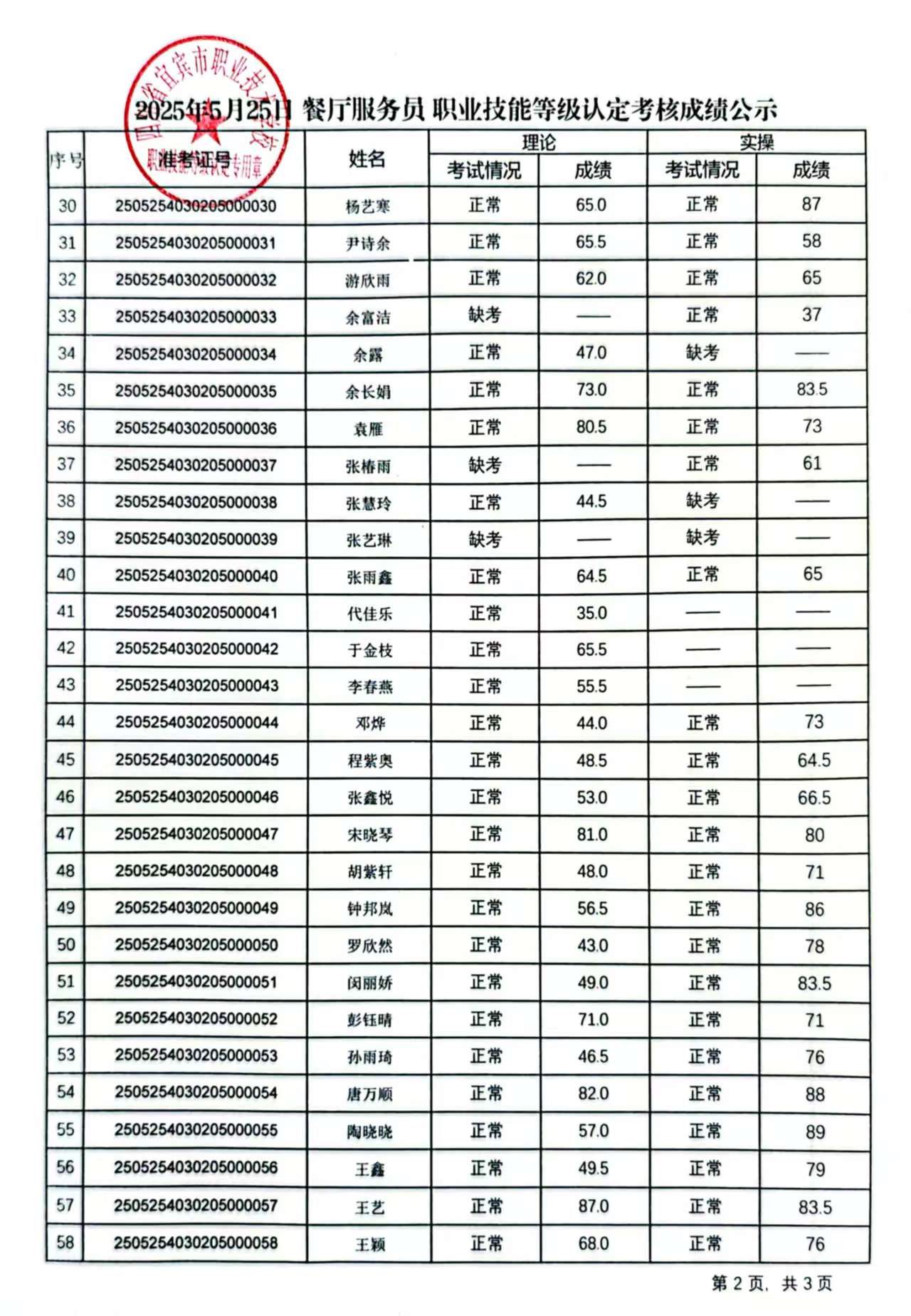 20250524宜职校餐厅服务员五级职业技能等级认定成绩公示(第9批)