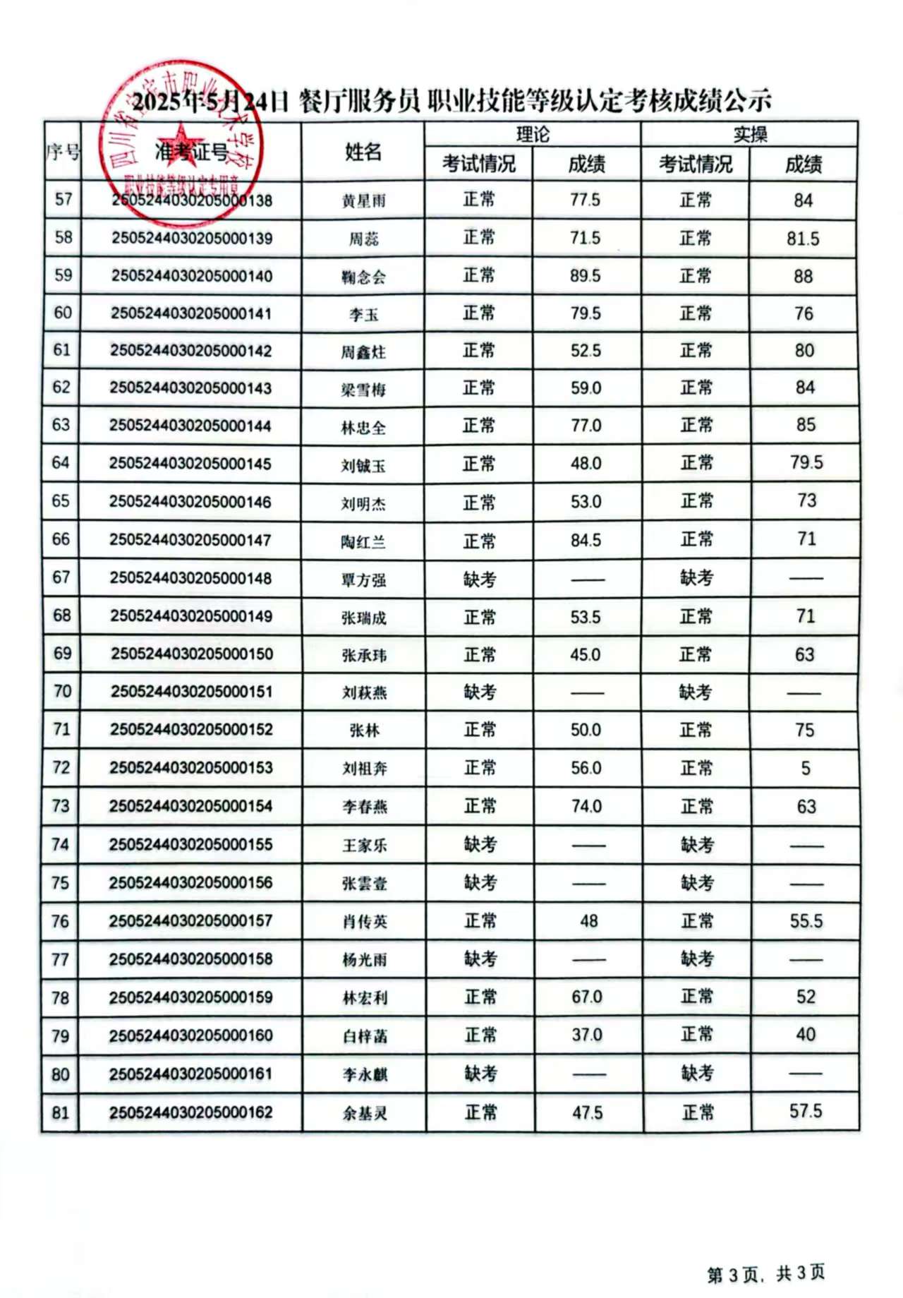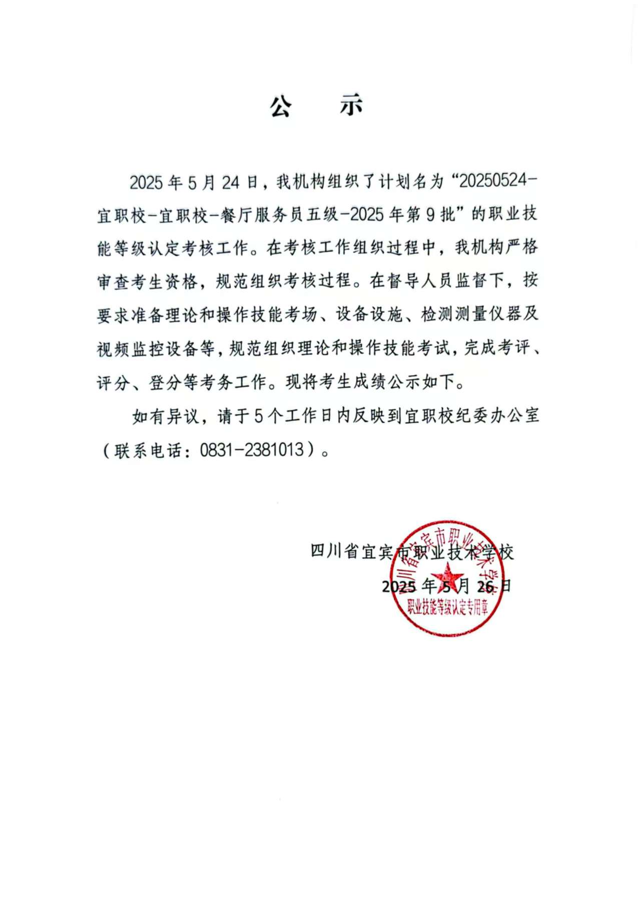 20250524宜职校餐厅服务员五级职业技能等级认定成绩公示(第9批)