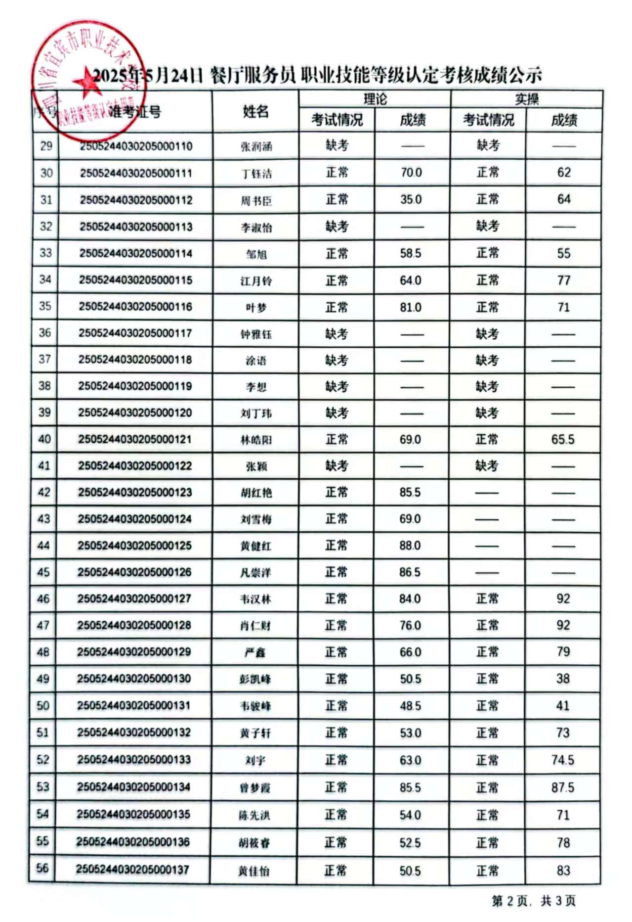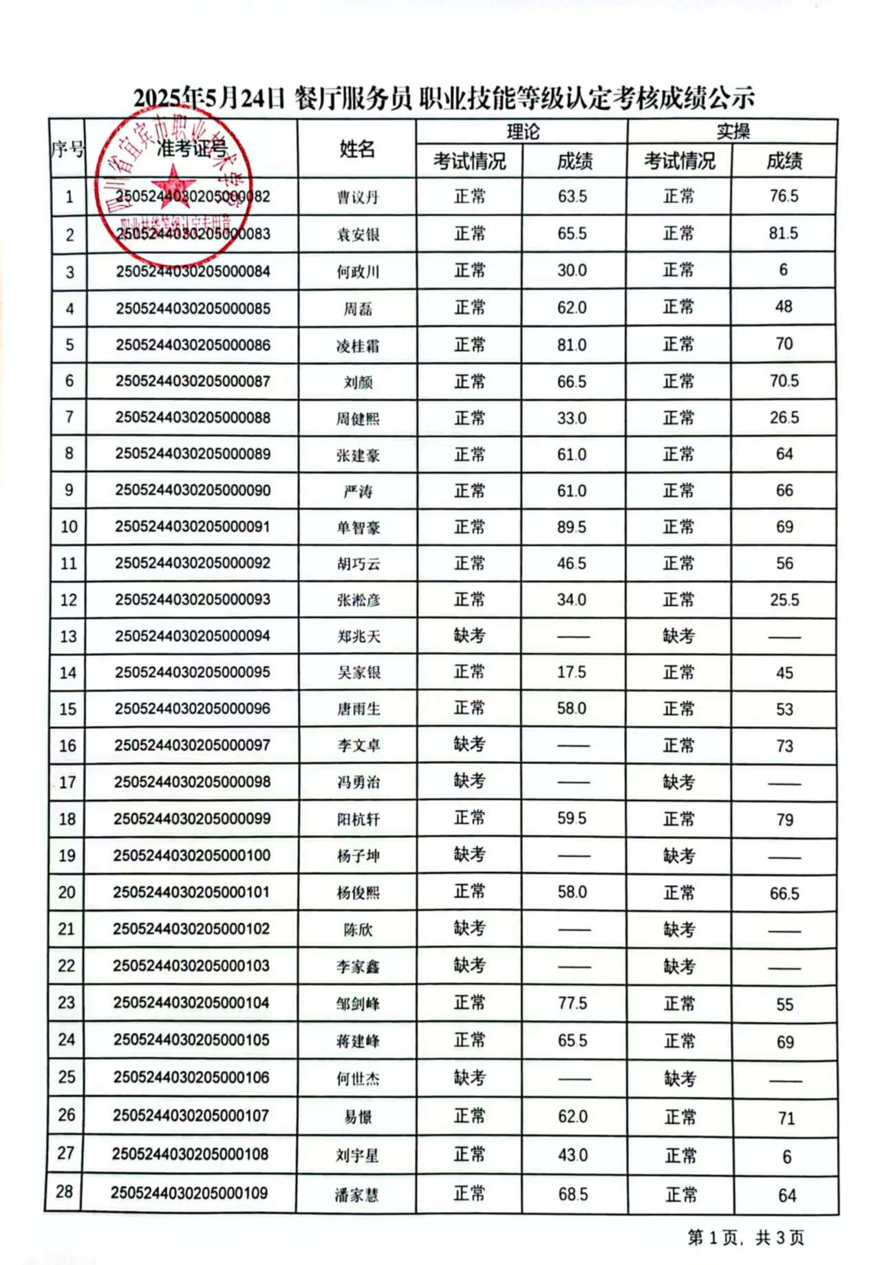 20250525宜职校餐厅服务员五级职业技能等级认定成绩公示(第10批)