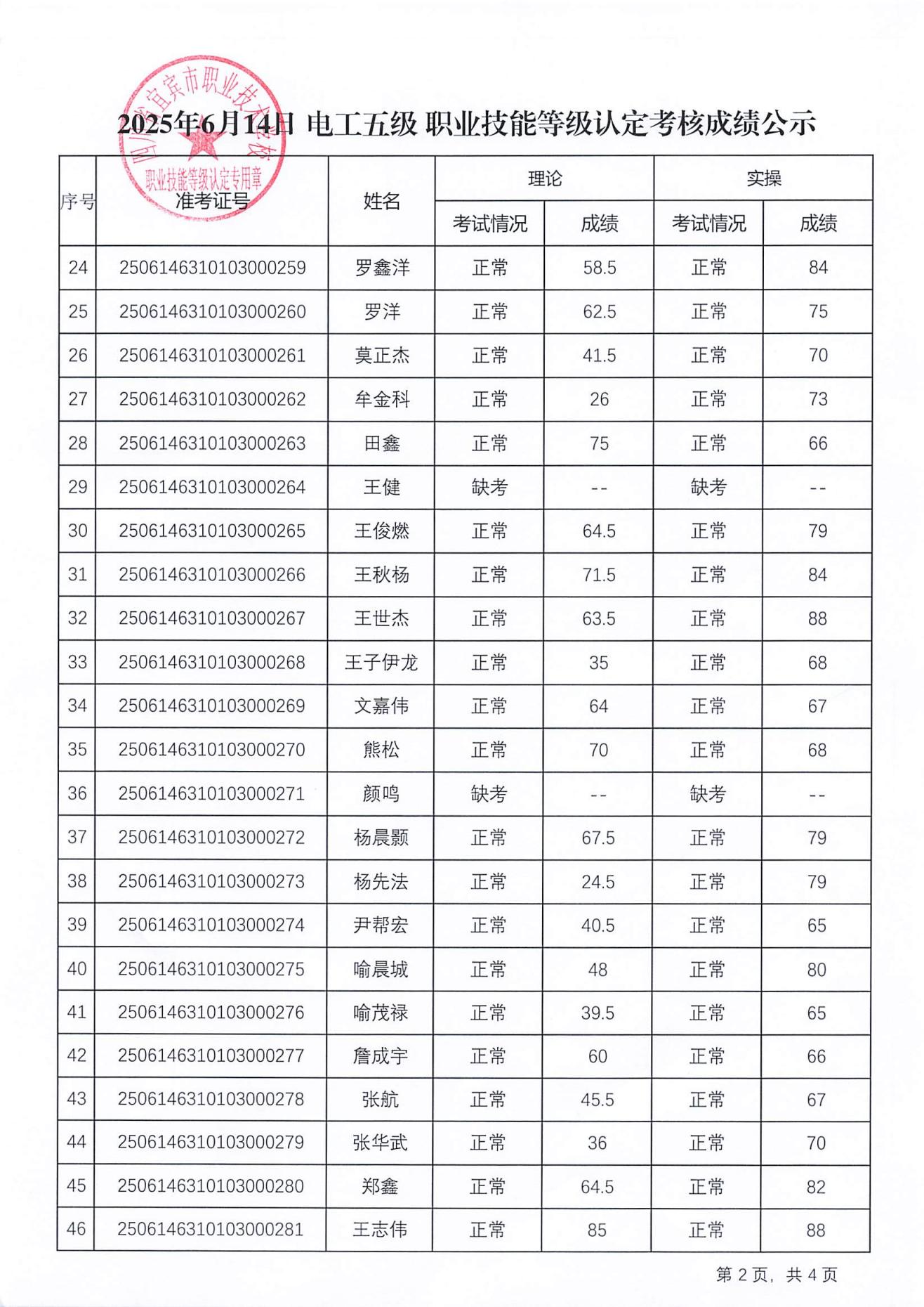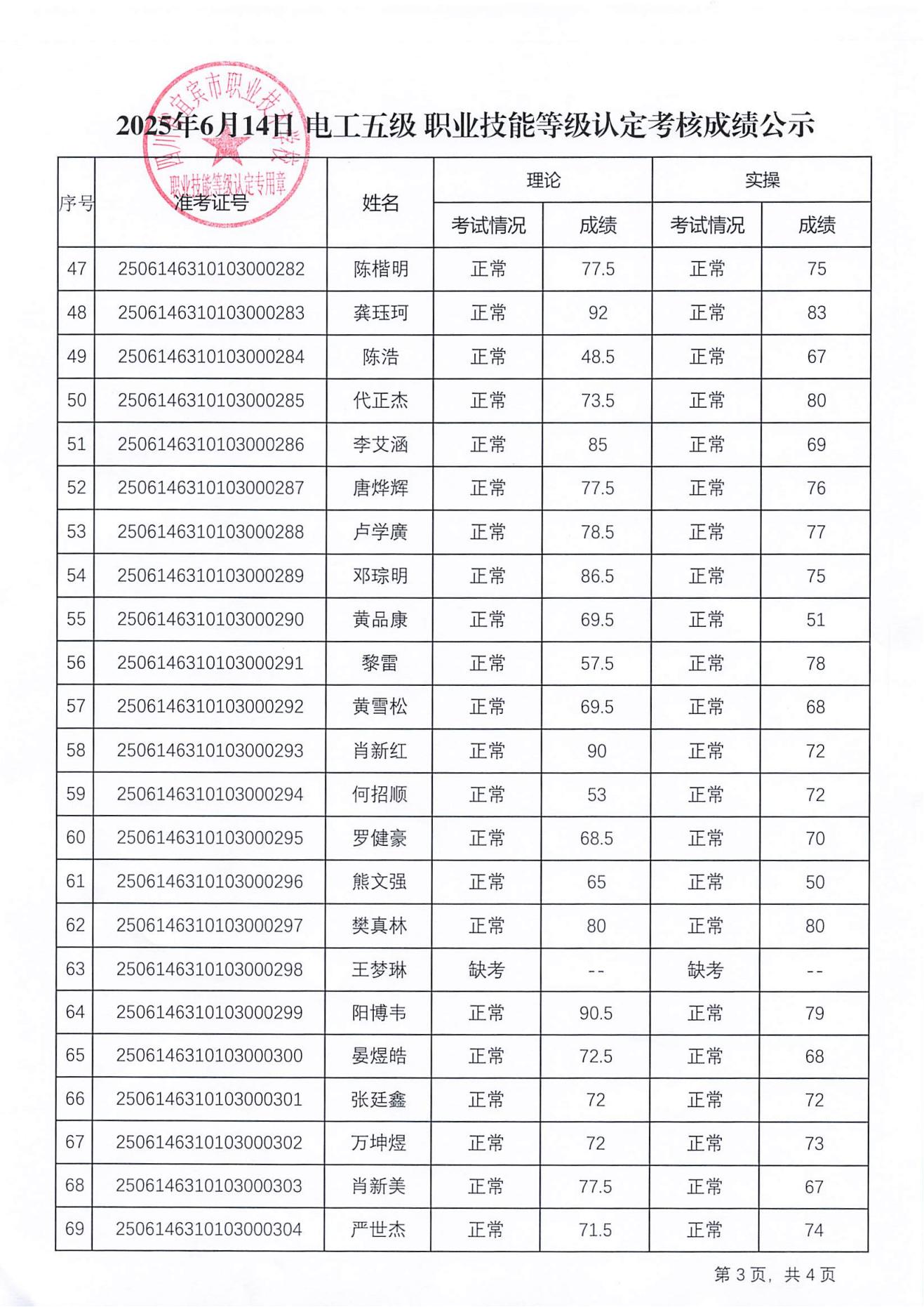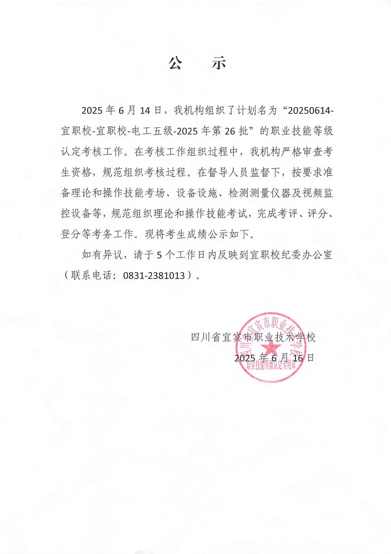 20250614宜职校电工五级职业技能等级认定成绩公示(第26批)