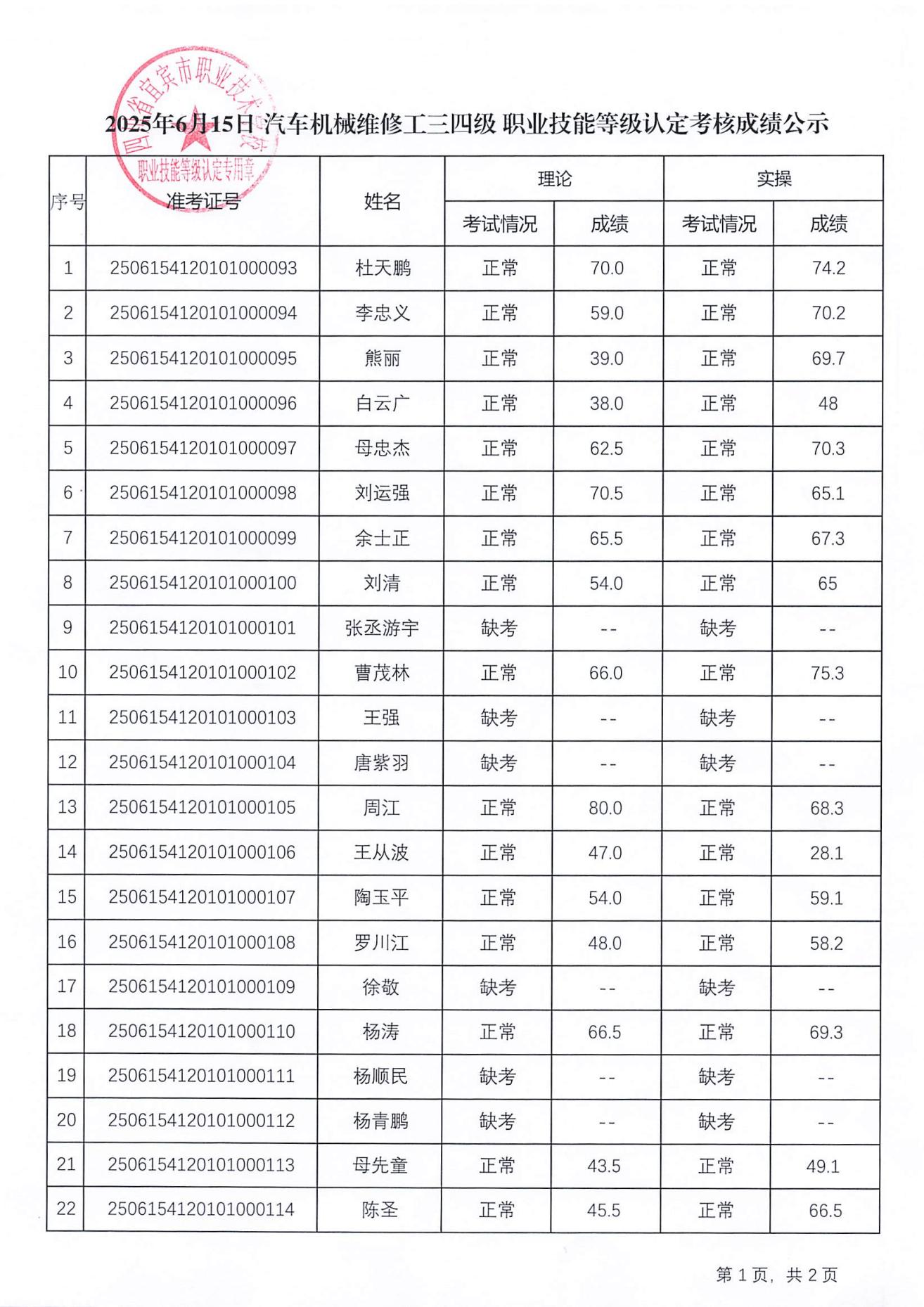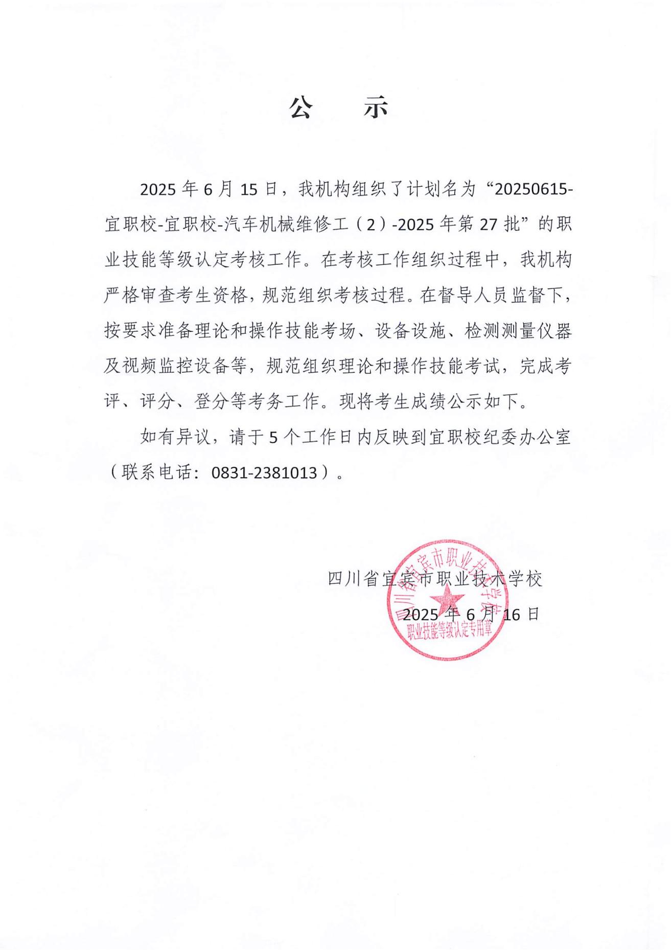 20250615宜职校汽车机械维修工三四级职业技能等级认定成绩公示(第27批)
