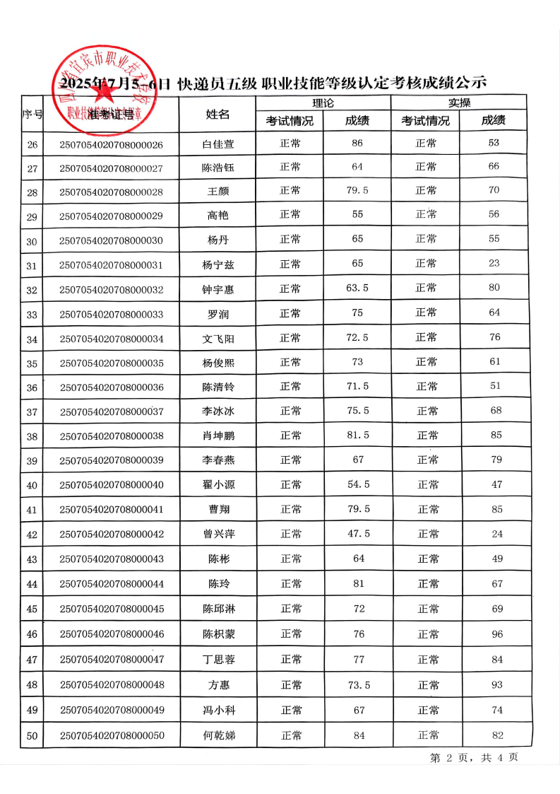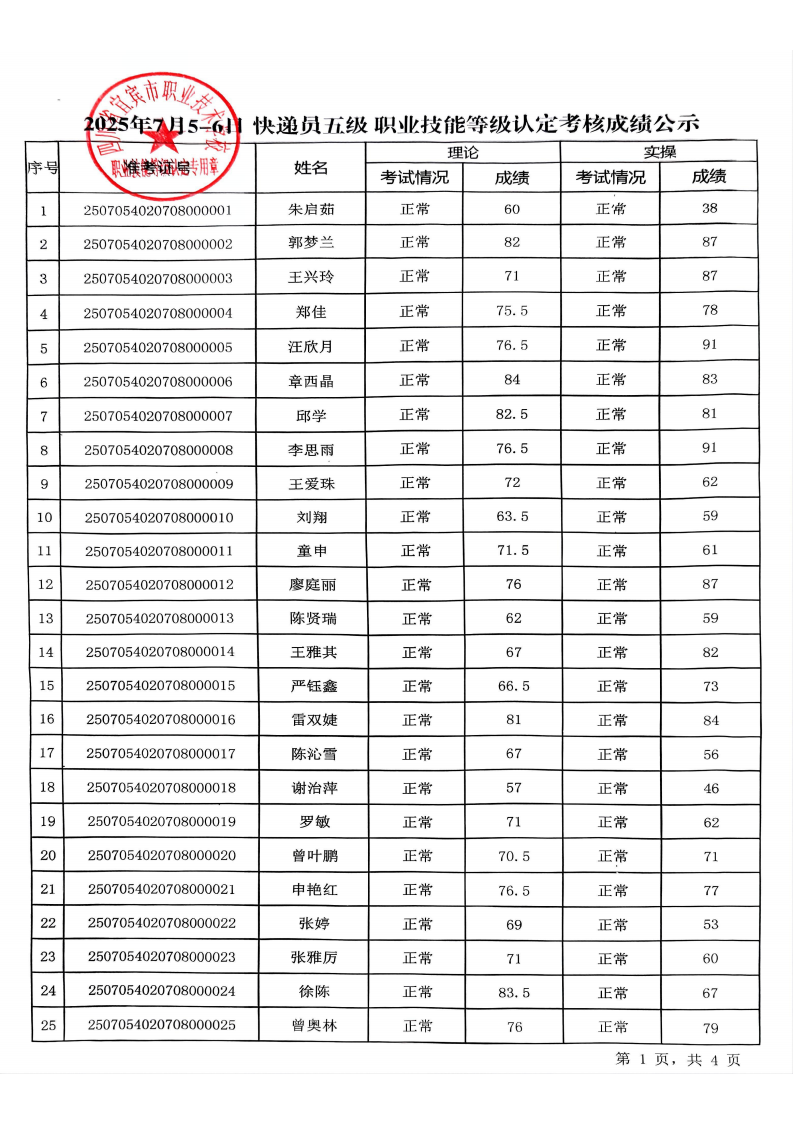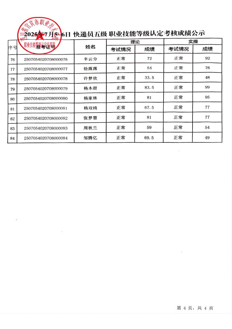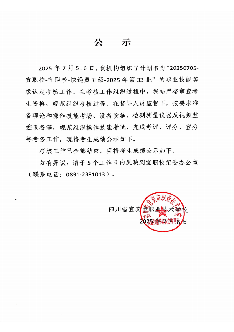 20250705宜职校快递员五级职业技能等级认定成绩公示(第33批)