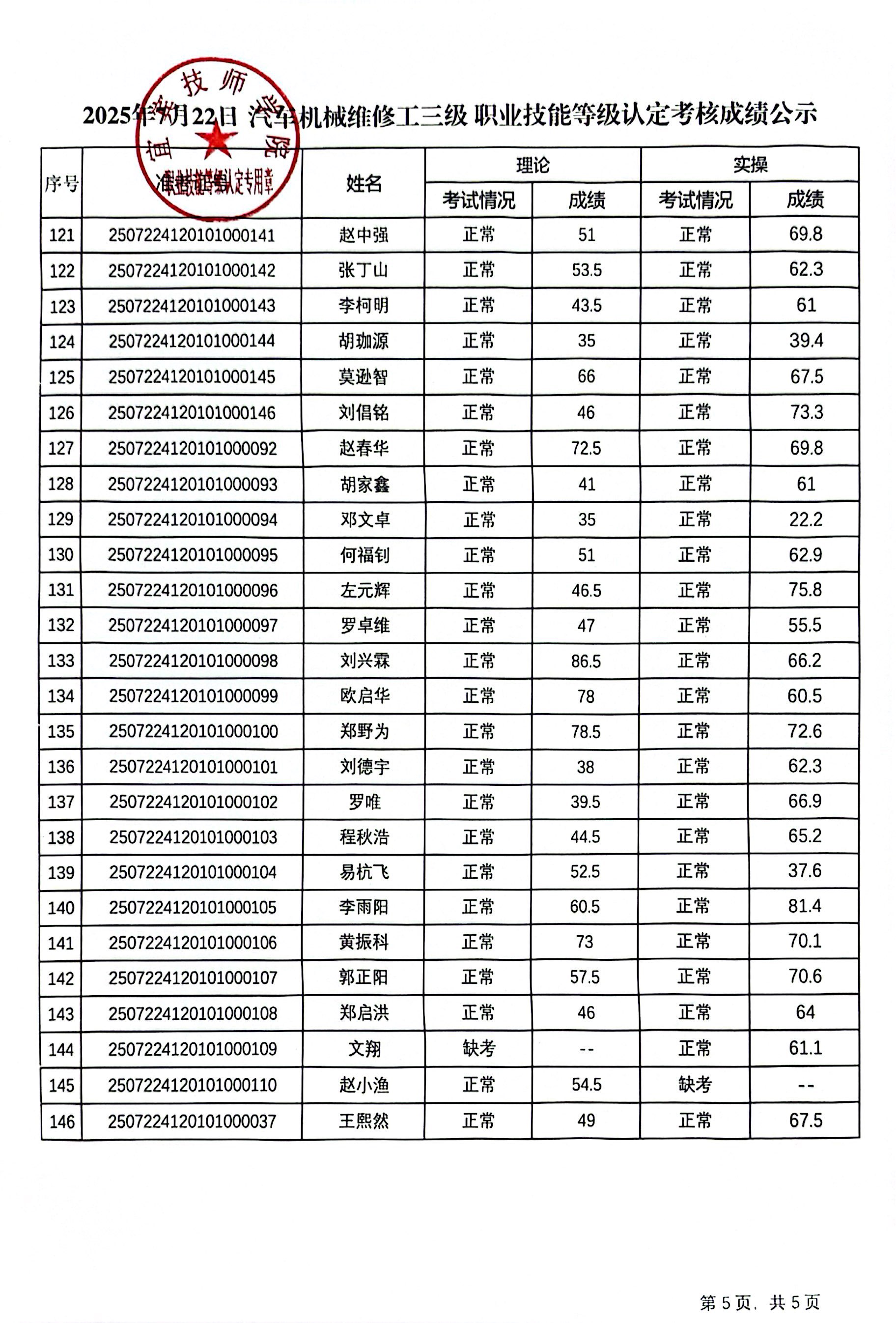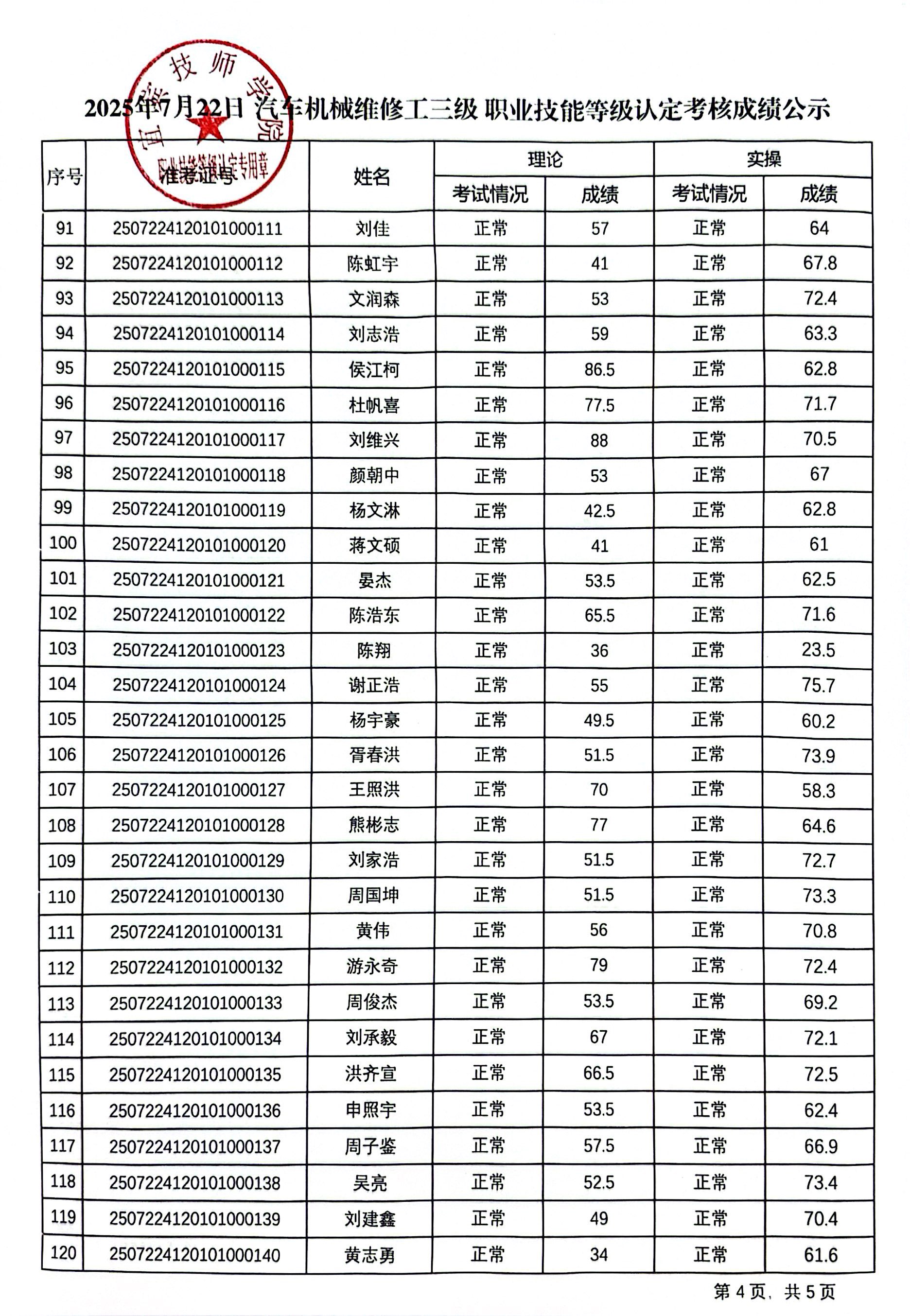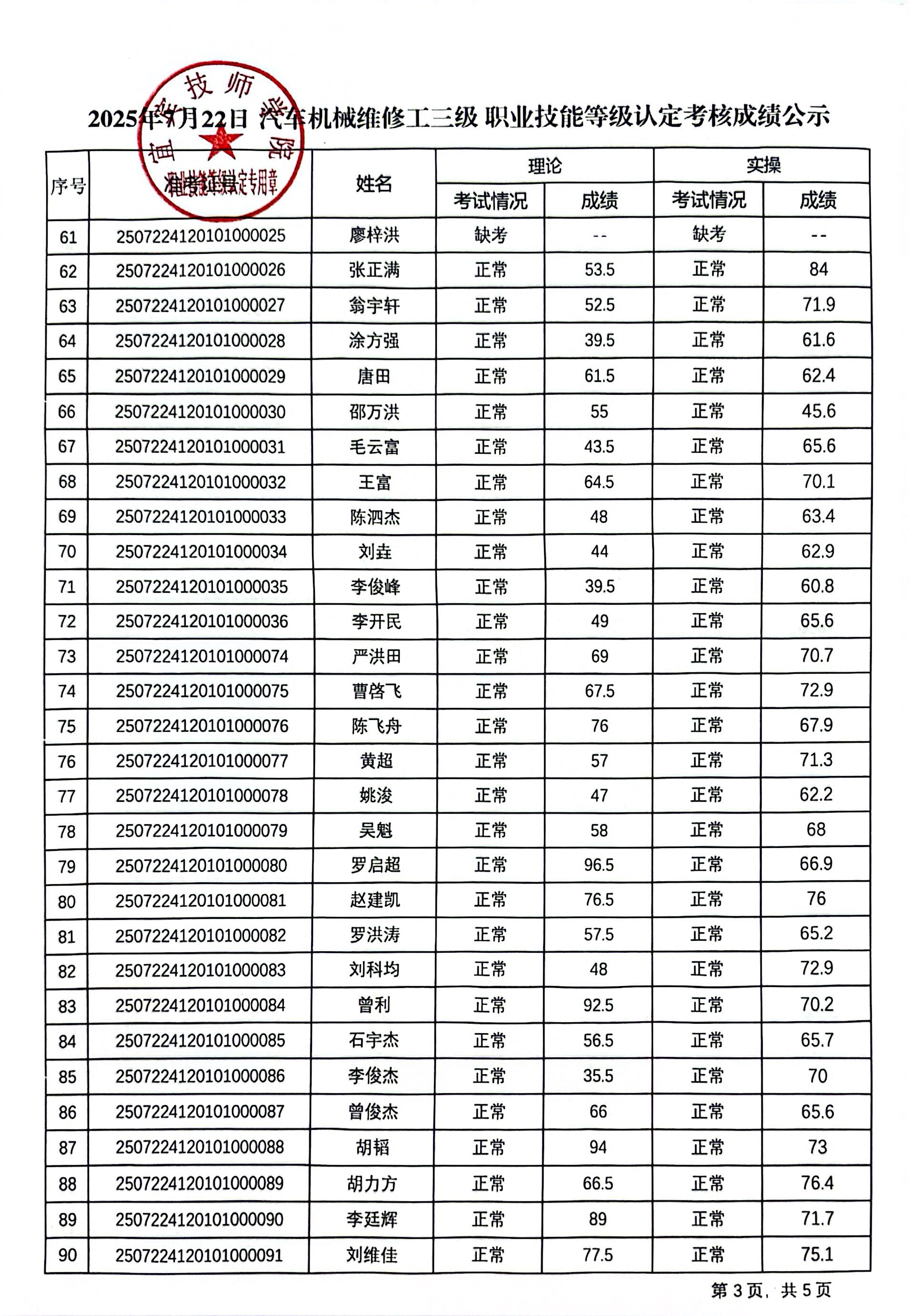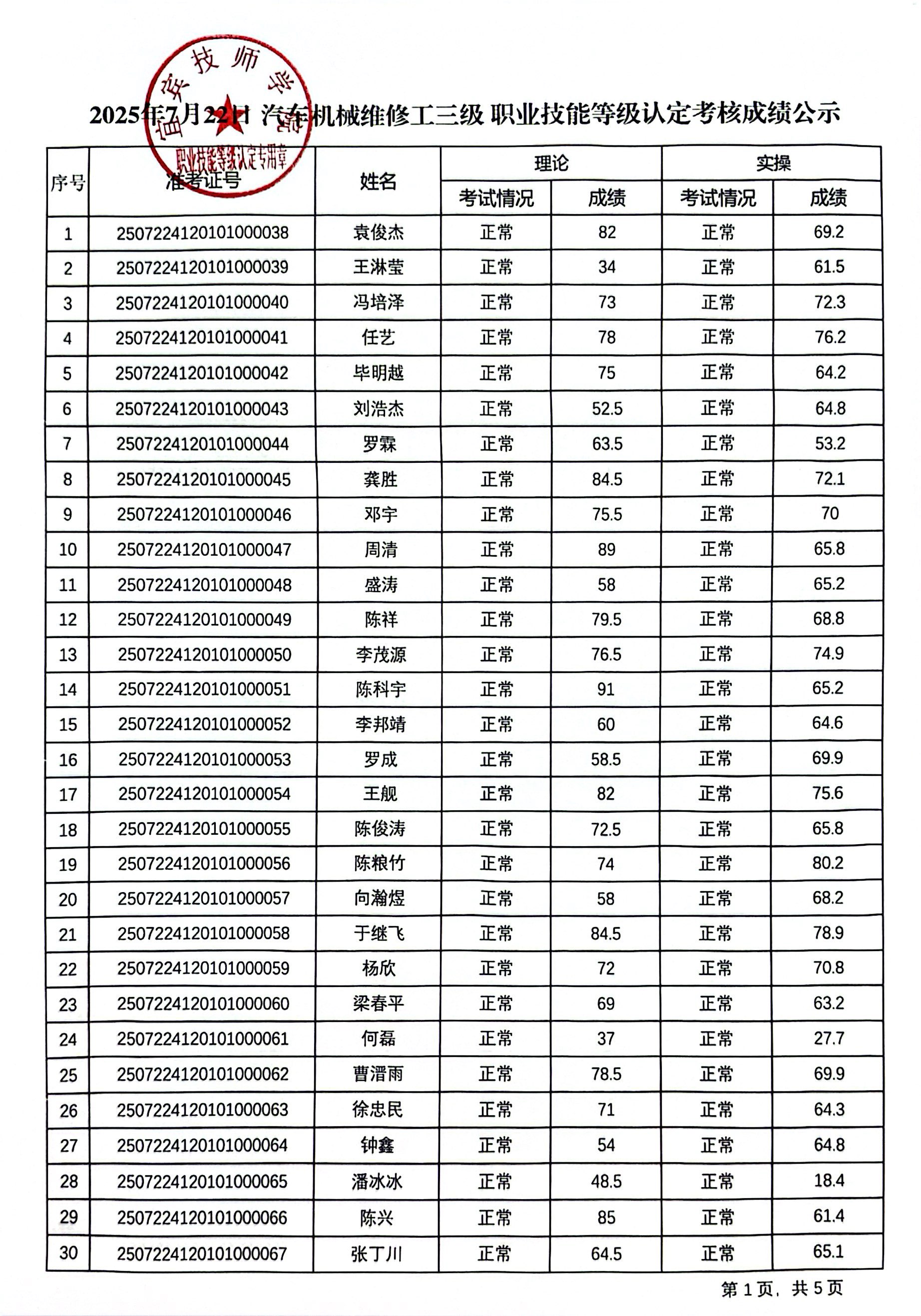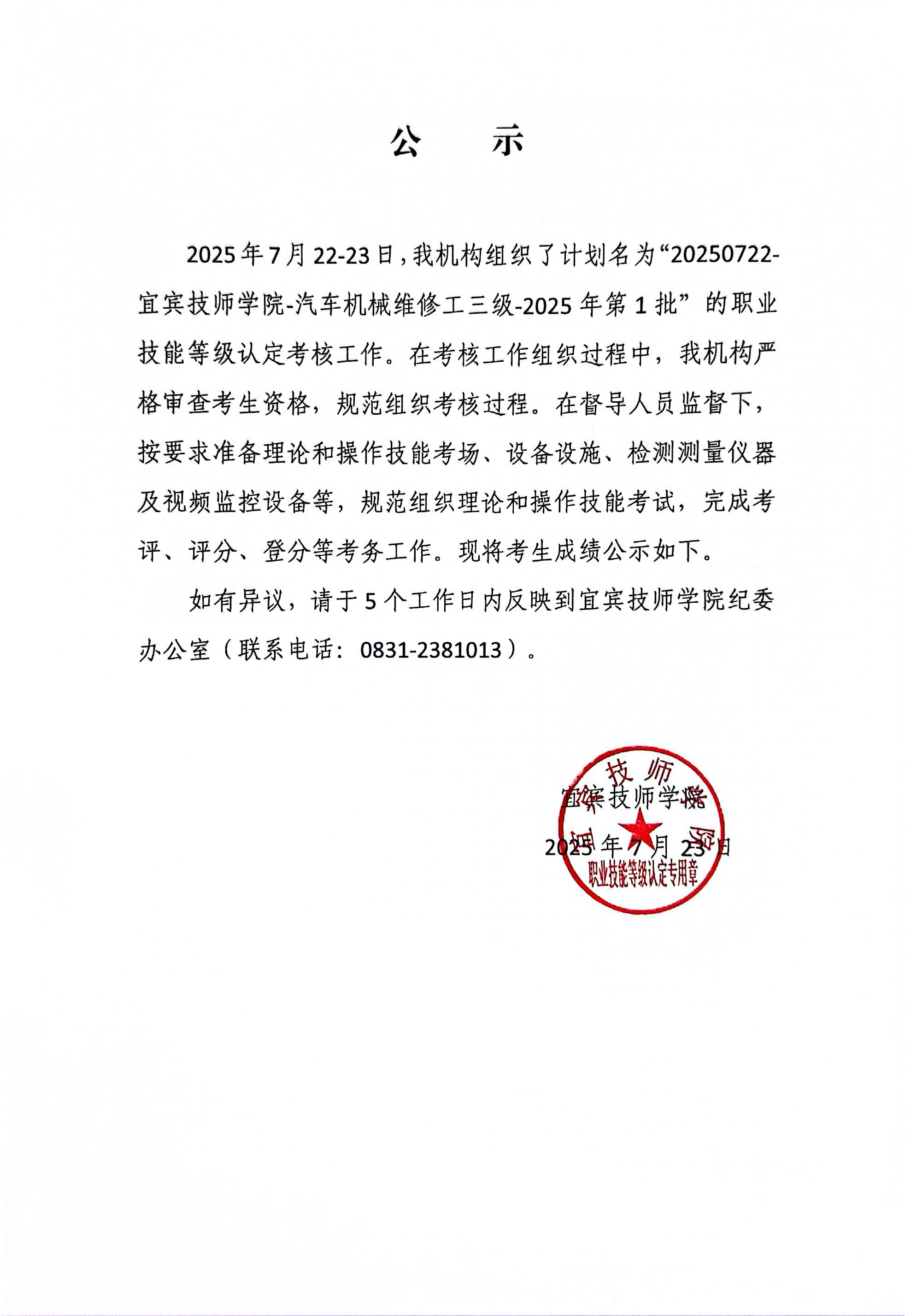 20250722宜宾技师学院汽车机械维修工三级职业技能等级认定成绩公示(第1批)