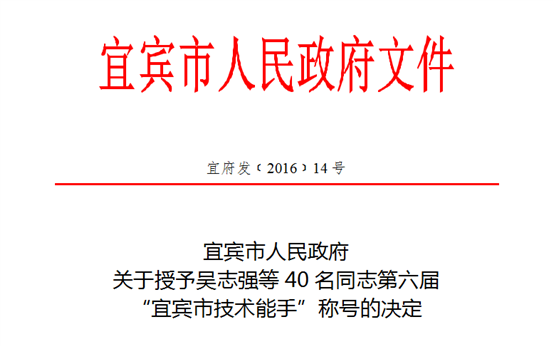 近日,宜宾市委、市政府发文表彰第六届宜宾市“突出贡献技师”和“技术能手”,我校教师王伟和陈小彬分别被宜宾市政府授予第六届“突出贡献技师”和“技术能手”称号。至此,我校已有5名教师获此殊荣。