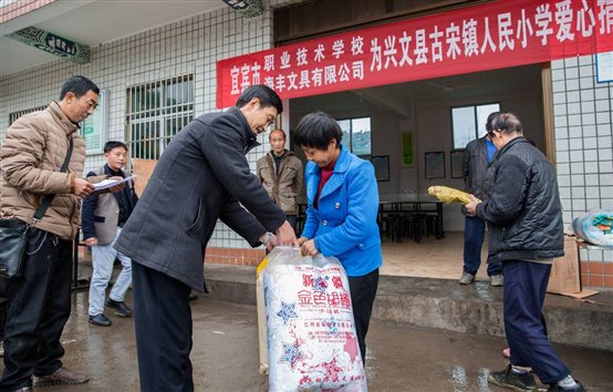 2016年1月12日,校党委委员、副校长何忠前,党委委员、纪委书记吴开泉受卿琳校长委托带领五支部、六支部、八支部党员志愿者到对口帮扶贫困村——兴文县古宋镇人民村进行驻村工作“回头看”工作,慰问看望驻村干部并对人民村小开展“爱心捐赠”活动,爱心商家宜宾市海丰文化用品有限公司吴总、古宋镇党委书记魏黔、古宋镇党委委员、纪委书记罗华兰出席捐赠仪式。