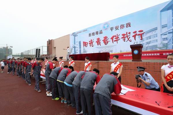6月25日上午10点,在“6·26”国际禁毒日到来之际,由宜宾市禁毒办、宜宾市教育和体育局、宜宾市职业技术学校联合举办的“拒绝毒品、平安你我、阳光青春伴我行”主题活动在我校大湾校区隆重进行,市委市政府和市教体局有关领导以及我校全体师生员工参加了活动。