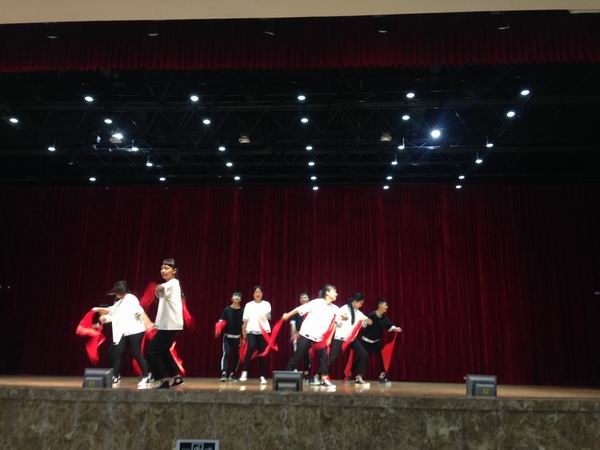 下午16:30分,文艺演出准时开始,节目有活力四射的热舞《sunny》、旋律优美的英文歌《start of something new》、现代感十足的独唱《阳光宅男》、古风古味的舞蹈《风中奇缘》……每个节目都凝聚着同学们辛勤的汗水和青春的智慧,观看的同学们也对精彩的节目报以热烈的掌声,演出在文艺部成员们精心编排的舞蹈串烧中圆满结束。