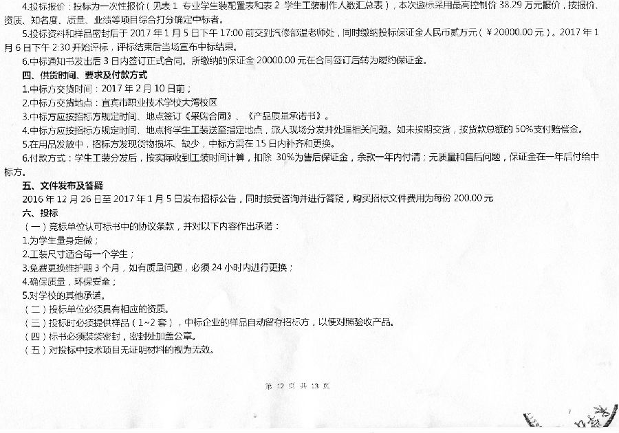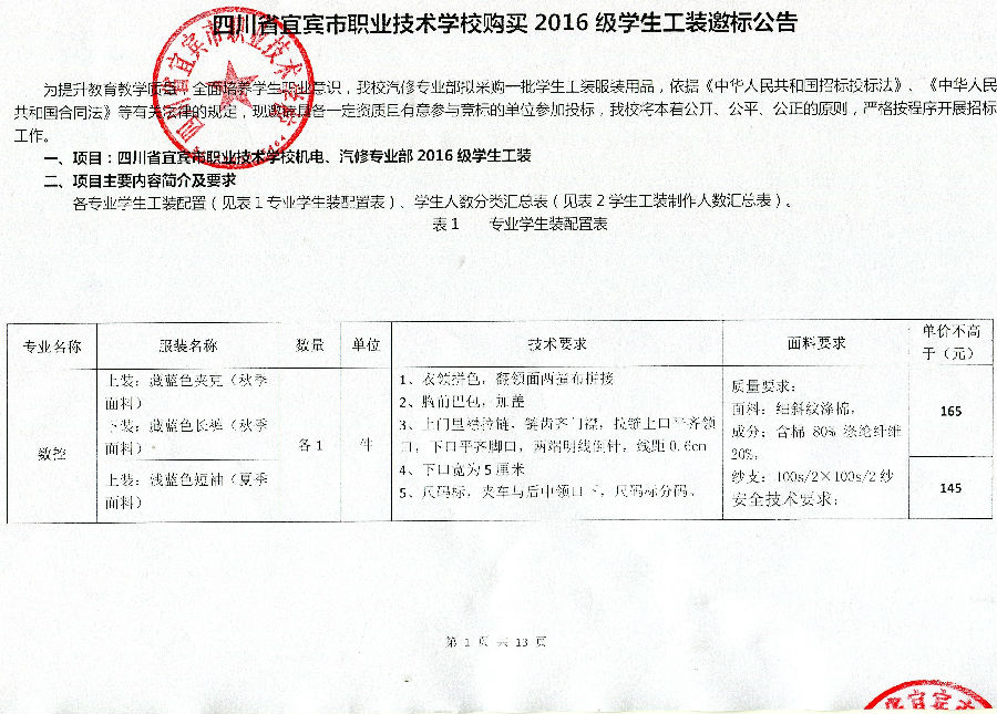 四川省宜宾市职业技术学校机电、汽修专业部购买2016级学生工装邀标公告
