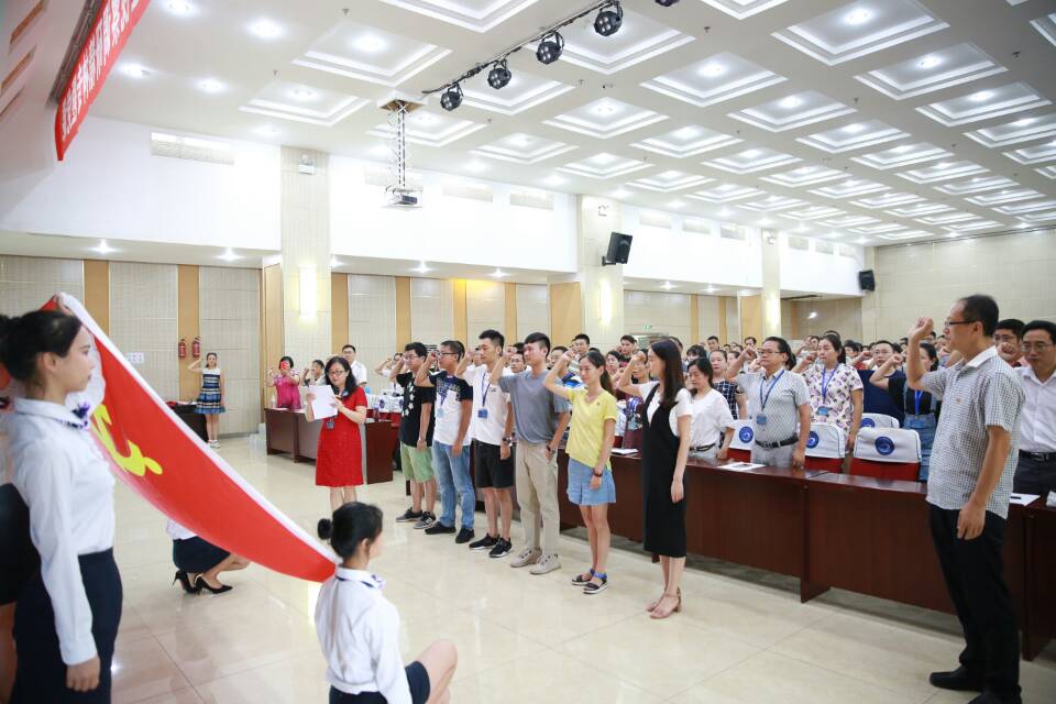 党员代表为4名新发展的党员佩戴党徽,全体共产党员举起右手,重温入党誓词,庄严宣誓。