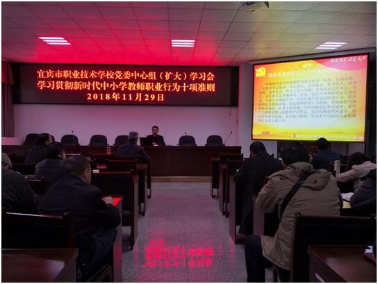 校党委中心组专题学习 教育部《新时代中小学教师职业行为十项准则》11月29日下午,校党委在乐业楼512召开中心组(扩大)学习会议,专题学习教育部新修订的《新时代中小学教师职业行为十项准则》(以下简称《十项准则》)和《中小学教师违反职业道德行…2018-11-30 来源:宜宾市职业技术学校